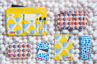 商品はノートカバー・ペンケース・ネームカードケース・バッグインバッグ(2サイズ)・ポーチの6種類です。ざっくりとした風合いのキャンバス地ファブリックを使用し、柄は動きのあるパターンと鮮やかなカラーリングの幾何学柄プリント3種類を揃えました。表面だけでなく、バイカラー風の裏地や糸など柄に合わせて1から選び、細部までカラーコーディネートにこだわっています。ビジネスシーンでスマートに持ち歩ける機能性を備え、収容物の整理や出し入れのしやすさにも配慮しました。