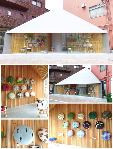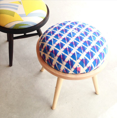 そのホタルスツールに14人のテキスタイルデザイナーの生地を張った座をのせて、